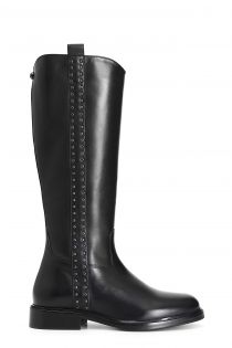 Bota de piel con una cascada de tachuelas laterales que aportan a la vez armonía y dinamismo gracias a un juego de pespuntes. la plantilla es de piel.