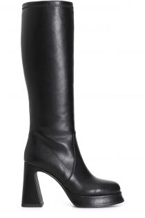Bota de mujer de piel sintética stretch. calzado en perfecto estilo setentero. el tacón alto de 95 mm junto con la plataforma de 18 mm proporcionan un equilibrio de altura belleza y comodidad.
