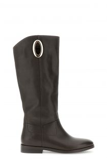 Botas de piel negra con un elegante accesorio ovalado dorado. Forro de tela, plantilla de piel y tacón bajo de 2,7 cm. Diseño sofisticado para un look femenino y versátil.