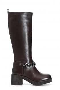 Botas de piel con tacón cuadrado y parte inferior de goma decorados con una cadena metálica de eslabón ancho que funciona como tobillera