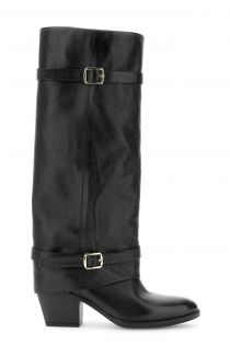 Botas de cuero hasta la rodilla con puños y hebillas doradas para un estilo rockero y chic. Su diseño atrevido, tacón cuadrado de 7 cm y forro de cuero crean un estilo audaz y sofisticado.