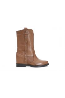 Botas de piel con tachuelas laterales y cuña interna. Un juego de pespuntes crea armonía y dinamismo.