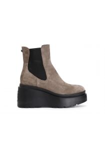 Botín de mujer de ante con bandas elásticas. plantilla de piel y suela con cuña personalizada con logotipo en relieve por detrás.