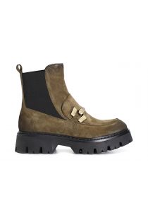 Botín de mujer de ante adornado con un horsebit y con elástico en el lateral. la plantilla es de piel. un modelo versátil y dinámico ideal para completar muchos conjuntos.