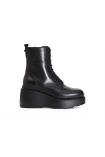 Botín de mujer de piel con cordones plataforma y tacón. plantilla de piel y suela con cuña personalizada con logotipo en relieve por detrás.
