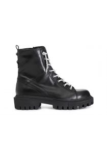 Botín de mujer de piel con cordones adornados con pedrería ultrabrillante. la plantilla es de piel. la suela dentada en material superligero estiliza la forma y la hace muy actual.