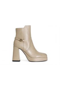 Botín de mujer en polipiel con particular accesorio cafènoir. plataforma de 22 mm y tacón de 100 mm. forma redondeada. cremallera interna en el interior del zapato. la plantilla es de piel. todo esto da equilibrio entre altura belleza y comodidad.