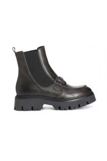 Botín con elástico de piel cepillada y pinza en la trabilla. la plantilla es de piel. la suela tipo tanque en material extraligero estiliza el modelo y lo hace hiperactual.
