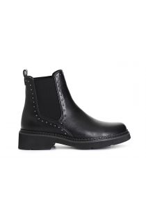 Botín de mujer en polipiel con elástico en la parte lateral del corte para facilitar el calce. todo ello enriquecido con microtachuelas cromadas. la plantilla es de piel.