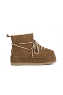botín de mujer con pelo sintético y cordones. camel
