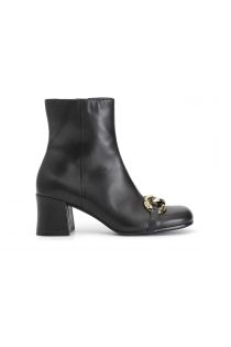 Botín de mujer en suave piel de napa con horsebit en el empeine y plantilla de piel. un calzado cómodo con un estilo innovador y refinado pero también muy femenino. la punta y el talón son cuadrados.