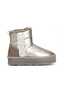 Botín de nailon adornado con una cinta con el logotipo de cafènoir hecha con pedrería el forro es de pelo sintético. plataforma de 35 mm de altura