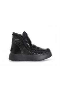 Botín de mujer de nailon con plataforma forro de imitación de pelo y logotipo metálico en la caña.