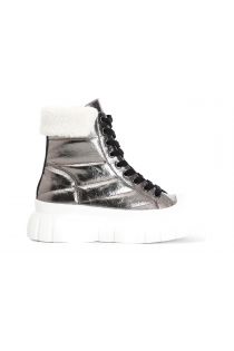 Botín deportivo con cordones en tejido laminado y relleno acolchado. se realza con un cuello de pelo sintético. el calzado perfecto para los fríos días de invierno. la suela elevada con un distintivo detalle de rayas.