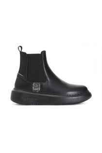 Botín de mujer en piel revestida con plataforma de 30mm. zapato de look deportivo con elástico en el lateral del zapato para facilitar su calce. inserción lateral de strass. la plantilla es de piel plantilla interna. punta redonda. altura de la suela 40 mm.