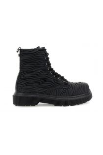 Botines con cordones para mujer en piel sintética plisada, con ocho ojales y cremallera interior. Forro de tela y suela resistente de 4 cm. Diseño original para looks urbanos.