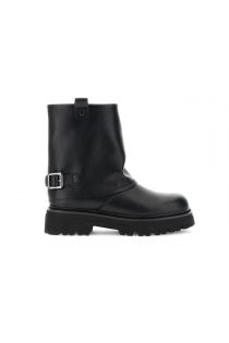 Botas de combate de piel revestida con puño y hebilla lateral. El tacón de 4 cm y la suela con tacos aportan audacia y comodidad. Ideales para un look atrevido y seguro.