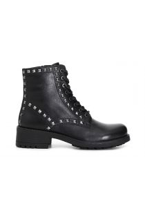 Botines estilo rock de piel con tachuelas cuadradas que adornan los pespuntes de toda la caña. Cierre frontal y tacón bajo.