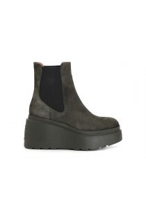Botines en piel de ante con bandas elásticas. Suela con cuña personalizada por el logotipo en relieve