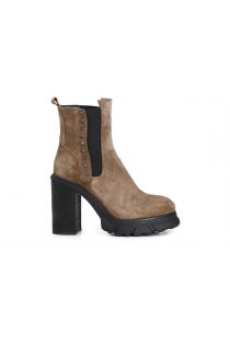 Botines en piel de ante con tachuelas y tacón alto. Plataforma de goma adornada con un detalle que hace referencia al mundo deportivo. Banda elástica lateral a juego
