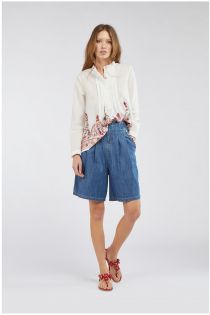 Camisa caftán de muselina de algodón adornada con un particular bordado en la parte inferior. Un juego de pespuntes y ligeros fruncidos crea un delicado movimiento.