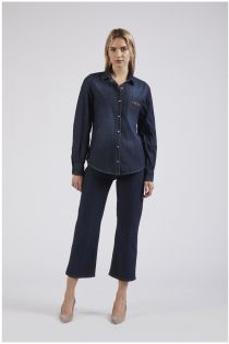 Camisa de tela denim ligera con mangas fruncidas. placa personalizada para rematar el bolsillo.