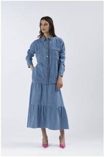 Camisa recta con bolsillos de parche de manga larga confeccionada en cómodo tejido denim. el cuello está adornado con un rico bordado exclusivo de pedrería multicolor.