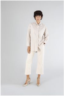 Camisa oversize de manga larga y aplicación de joya en el cuello. confección en popelín de algodón elástico a rayas. perfecto para combinar con pantalones o jeans.
