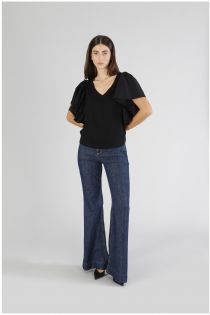 Camiseta bimateria con volantes en hombros y escote en "v". modelo equipado con broche en forma de boca. perfecto para lucir en looks casual o más elegantes.