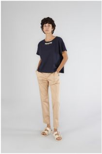 Camiseta de cuello redondo y manga corta confeccionada en punto de algodón. modelo con aplicación de pedrería para decorar el escote.