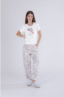 Camiseta de jersey de algodón elástico con corte regular. el cuello está rematado con un ribete festoneado de lúrex y es de manga corta. el estampado frontal presenta un rostro femenino en delicados tonos pastel lo que la hace a la vez femenina y versátil. la modelo mide 175 cm y lleva una talla s. corte: regular.