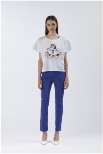 Camiseta de manga corta de punto de algodón elástico. elegante reproducción de un rostro femenino y flores. los gráficos están adornados con pedrería engastada con elementos tridimensionales.