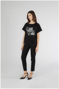 Camiseta de manga corta y cuello redondo confeccionada en punto de algodón. los gráficos reproducen la inscripción "querido amor hola" con pedrería.