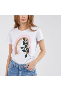 Camiseta de jersey de algodón con un aire vagamente étnico, con un ramaje de hojas bordadas que cruzan un lazo estampado en colores suaves.