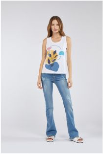 Camiseta de tirantes de algodón elástico con estampado multitécnico y bordado en la parte delantera