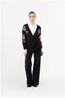 Cárdigan con escote en "v" confeccionado en hilo de cashmere con flores de lentejuelas bordadas. suave y cálido es una propuesta ideal para llevar en invierno combinado con unos jeans y anfibios para un look trendy de día o de oficina.