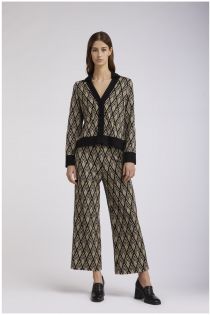 Cárdigan corto de manga larga y cuello tipo polo confeccionado en tejido jacquard con diseño geométrico.