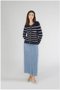 Cárdigan de rayas con estampado de perforado confeccionado en hilo de viscosa. manga larga y cierre de botones. prenda imprescindible y versátil para la temporada de primavera.