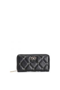 cartera con cremallera redonda, aplicaciones de remaches de colores y logo bicolor black