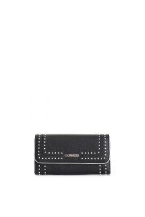 Cartera con solapa con aplicación de mini remaches bicolor. logotipo metálico.
