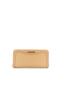 Cartera con efecto piel, cremallera, marco acolchado y letras metálicas.
