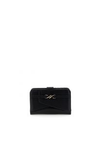 Cartera de piel sintética con diseño patchwork y logotipo metálico. Bolsillo con cremallera para monedas.