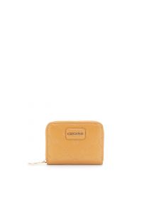 Cartera con cremallera efecto piel, estampado integral y parche de letras metálicas.