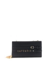 Cartera de piel sintética con dos compartimentos, uno con solapa y otro con cremallera, decorada con rayas con letras y hebilla. Bandolera de cadena extraíble.