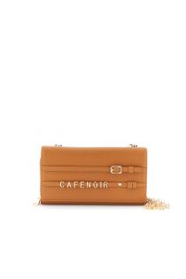 Cartera de piel sintética con dos compartimentos, uno con solapa y otro con cremallera, decorada con rayas con letras y hebilla. Bandolera de cadena extraíble.