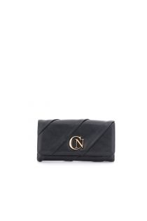 Cartera efecto piel con solapa plegable y logo café metálico.