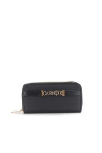 Cartera grande con doble cremallera en piel granulada con detalles de piel sintética suave en contraste y letras metálicas.