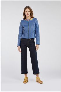 Cazadora corta de piel sintética con forro estampado, sin cuello y realzada por un juego de cortes que dan forma al centro delantero y a la espalda.