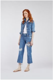 Cazadora de tela denim no elástica adornada con bordado multicolor, botonadura frontal y bolsillos. Modelo clásico de denim con variaciones decorativas únicas e inconfundibles, icono de la línea de vaqueros CafèNoir.