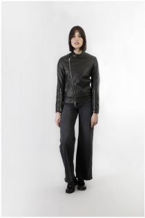 Cazadora biker con cremallera frontal en mangas. confección en símil piel con efecto laminado. bolsillos laterales y cierre de cremallera transversal. el forro está acolchado y acolchado. artículo versátil para agregar a tu guardarropa.